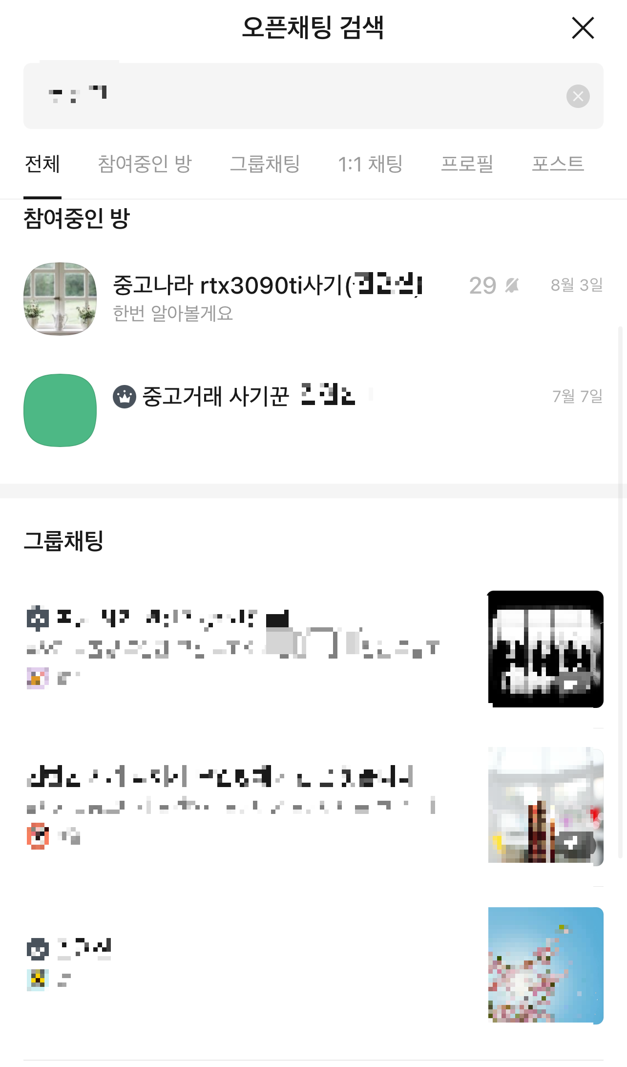 아래 카카오톡 오픈채팅 검색 내용은 제가 실제 사기 당했던 예금주 이름인데 왜 아무도 이걸 알려주지 않았을까요. 정말 슬픕니다. 동일이름을 사용하는 누군가가 피해볼까봐 이름은 지우고 올려봅니다.