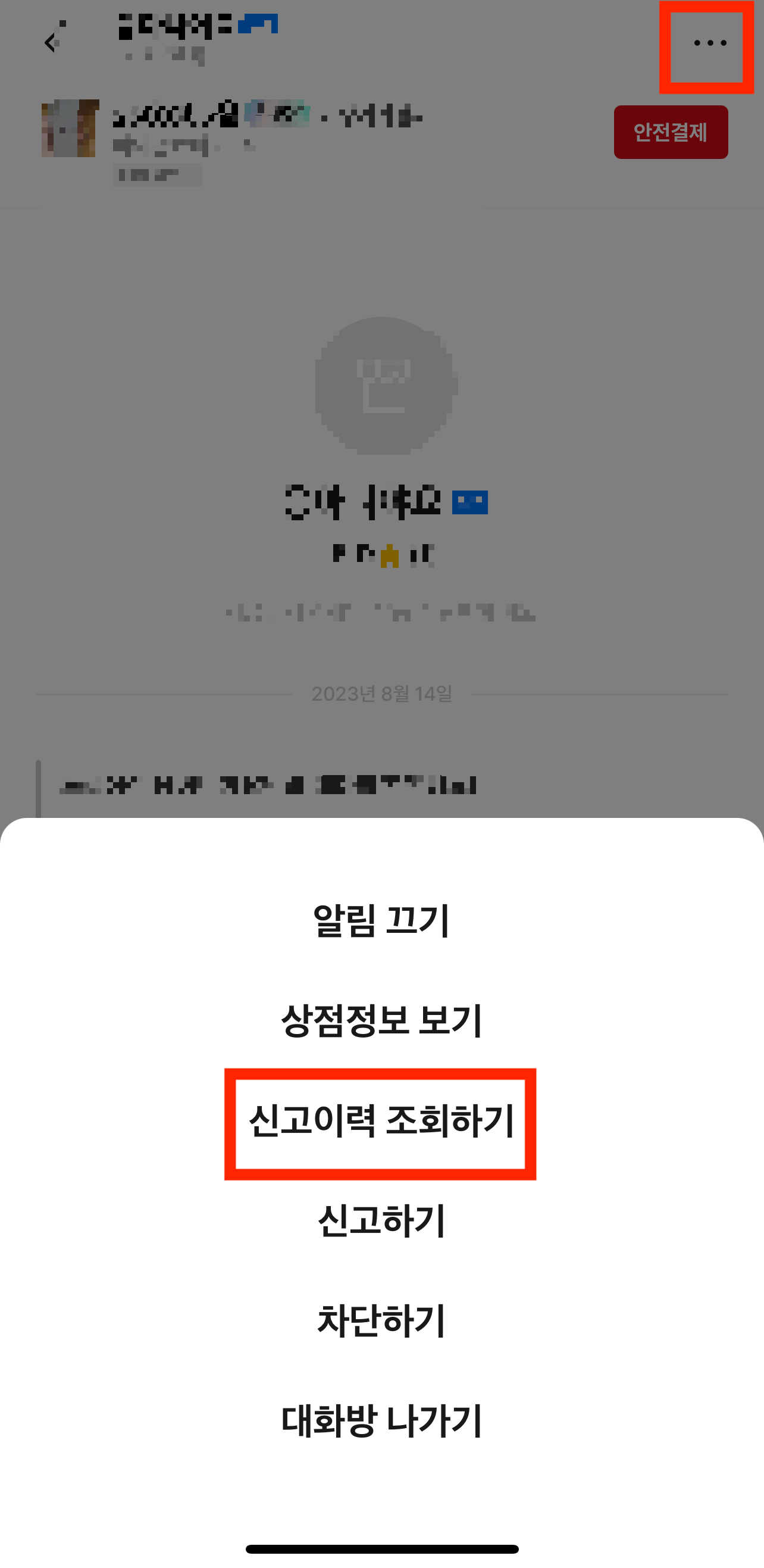 번개장터는 전국에 있는 구매자를 대상으로 중고거래를 하기 때문에 택배 거래가 많고 이로 인한 중고 사기 확률이 높습니다. 우선 판매자와 채팅을 하면 우측 상단을 터치하고 신고이력 조회하기를 눌러 주면 총 3가지 정보로 사기 정보를 조회할 수 있습니다.