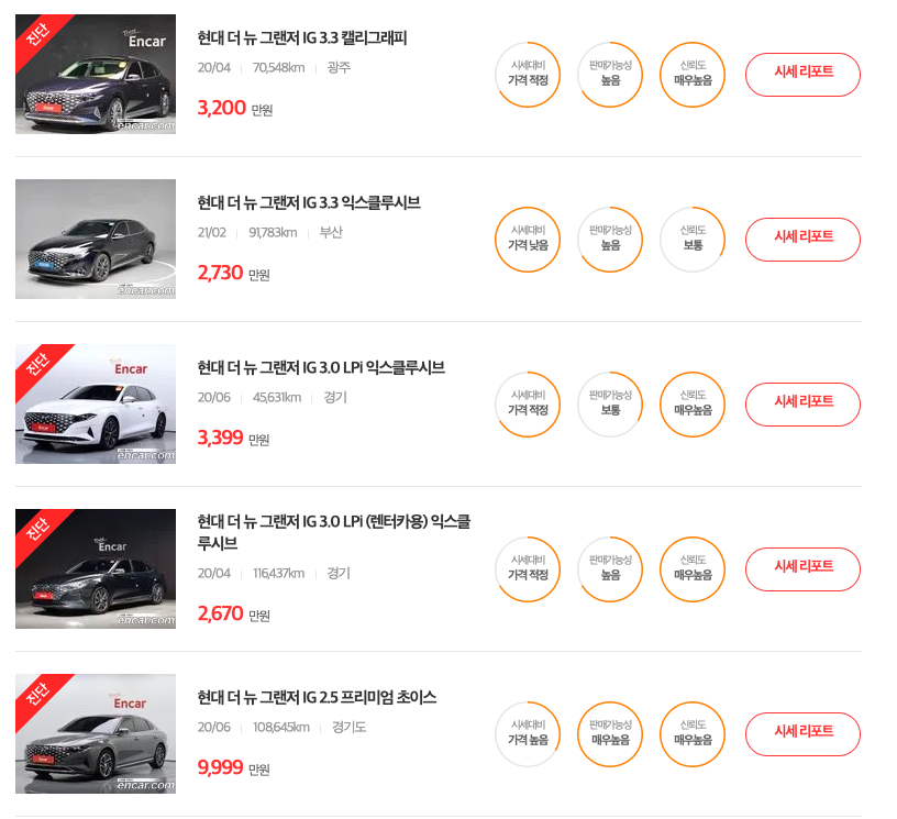 1. 그랜저 (더 뉴 그랜저 IG , 시세 2,116 ~ 3,955만원)